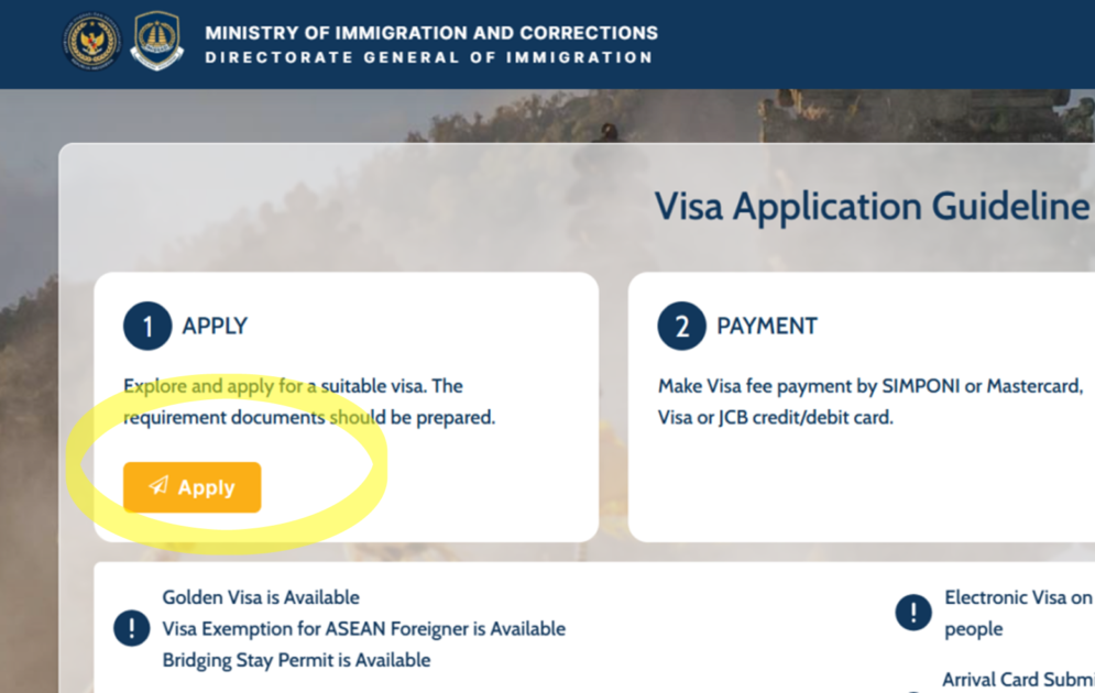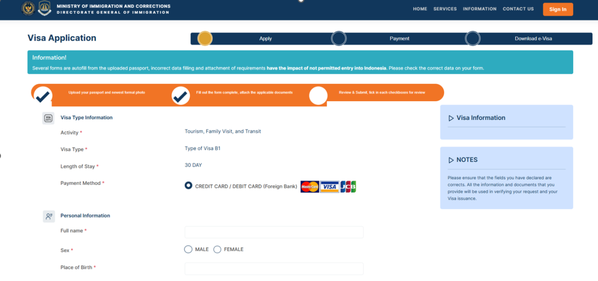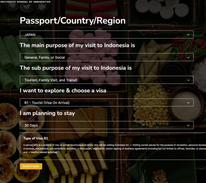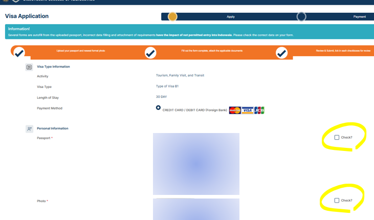 準備しておくものとしては、1)パスポートの写真、2)顔写真、3)電話番号、4)滞在先の住所、5)インドネシアからのフライトチケット(pdf形式)、6)メールアドレス、7)クレジットカード です。