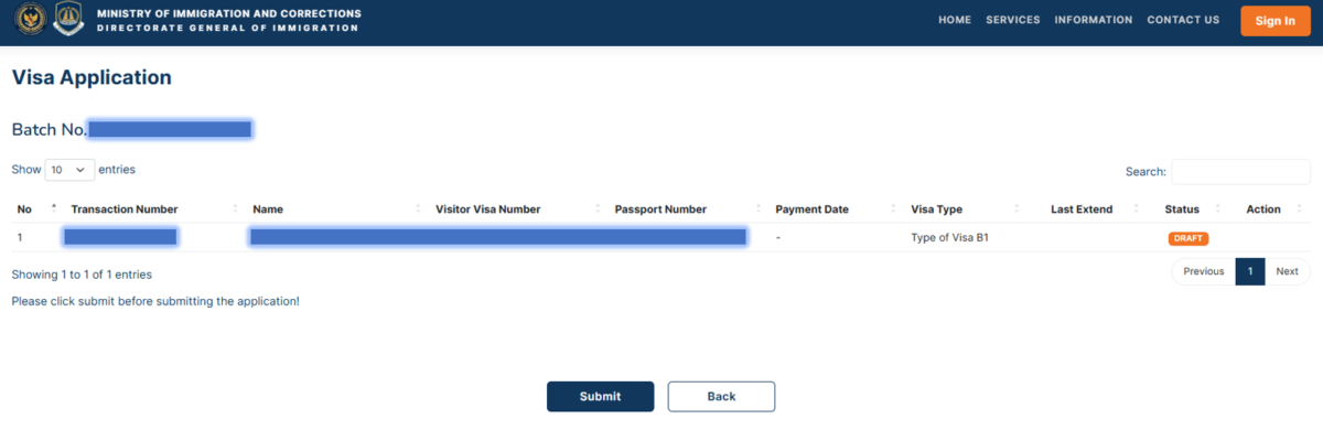 ▶ 8) ビザ申請のリストです。複数人の申請に対応できるようですね。問題なければ Submit をクリックです。