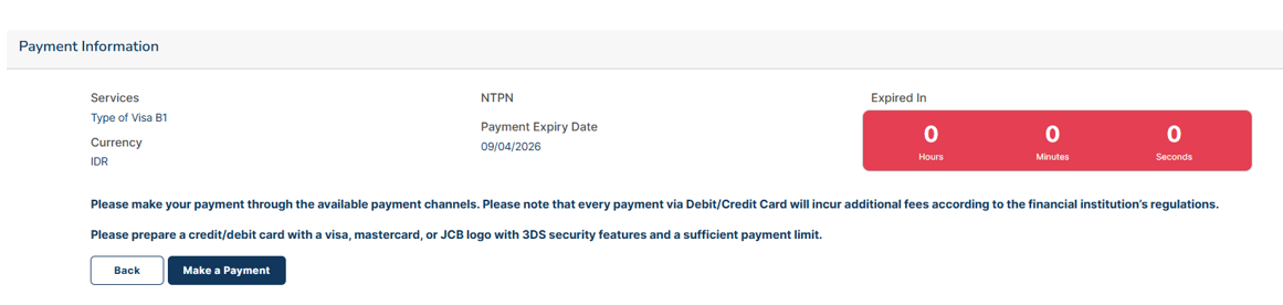 VISA申請内容の下にある Make a Payment をクリックし、支払い画面に移行し、50万ルピアを支払います。ビザの発給料金自体は50万ルピア(4661円:2026年4月現在)ですが、e-VOAの場合はそれに加えてクレジットカードの手数料を支払うことになります。