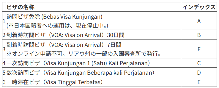 パスポートは入国時に6か月以上の残存有効期間と十分な空白の査証ページが必要です。ビザですが、今回ご紹介するeVOA(到着時訪問ビザ(VOA: Visa on Arrival)30日間の電子版)がこれに当たります。このビザですが、目的に合致したものを申請・所持する必要があります。参考までに以下、在インドネシア日本国大使館様のHPからの抜粋を貼付けしておきます。