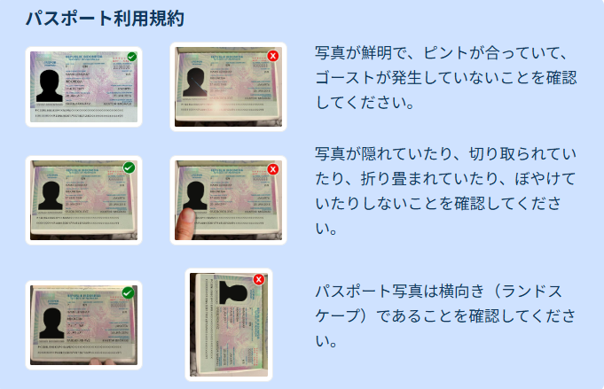 パスポート写真は文字情報が読み取れるように焦点をあわせて、ぼやけたり、反射したり、指等で隠れていないようにします。また横長で撮影してください。