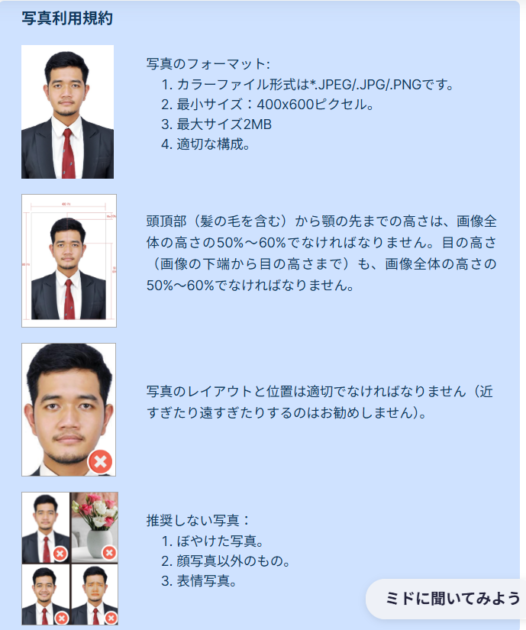 顔写真ですが、こちらは下の見本写真を参考にスマホ等で撮影してください。頭の位置、顔サイズはおおよそ見本のようであればOKのようです(ててぺろ経験談)。ただし400×600px以上で、サイズが2MB以下になるようスマホ等で撮影してください。写真形式は(JPEG、JPG、PNG)です。